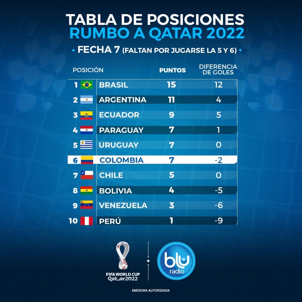 En qué puesto está Colombia hoy Mira la tabla de posiciones en directo y conoce en qué puesto se encuentra Perú Chile Colombia Argentina y. Tabla de posiciones de Eliminatorias Conmebol.